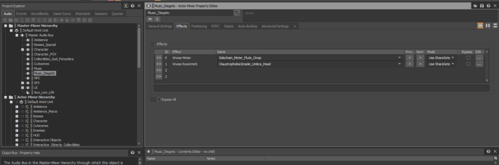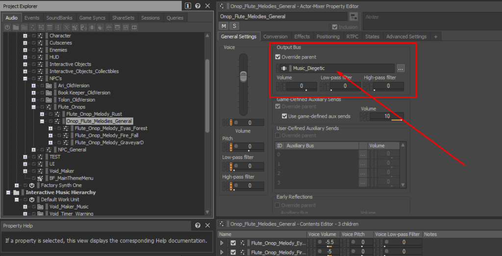 Because these sounds have to be spatialized, they can’t be in the Interactive Music Hierarchy in Wwise. They must be inside the Actor Mixer Hierarchy.