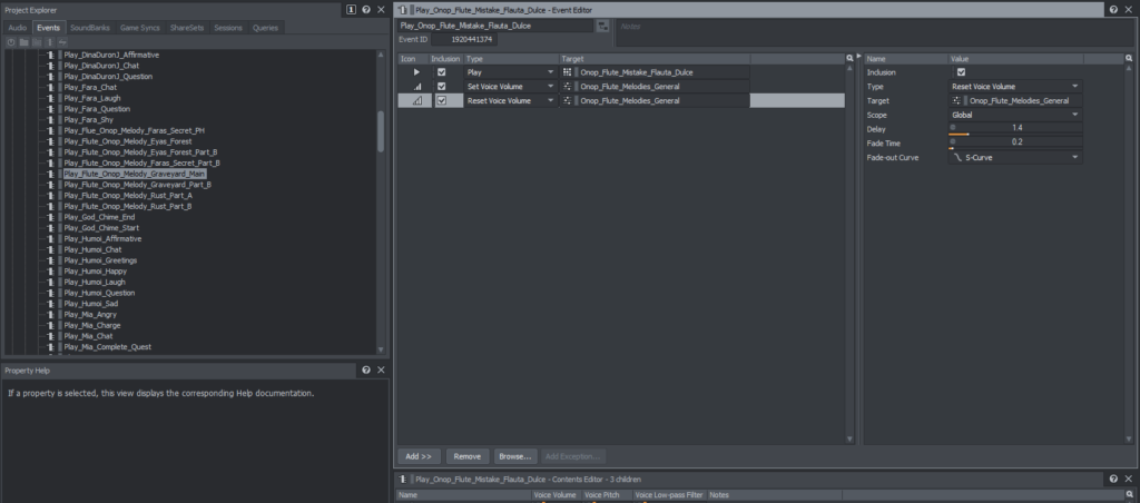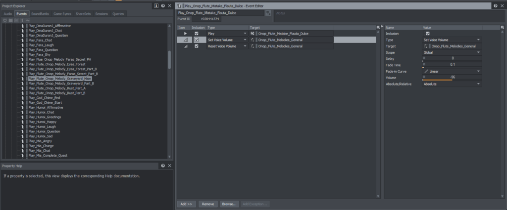 You can even interrupt their beautiful flute solo with a sword attack. This will trigger a “Flute_Mistake” sfx that will Set the Voice Volume of the Melodies to -96 and Reset the Voice Volume after a 1.3 seconds Delay.