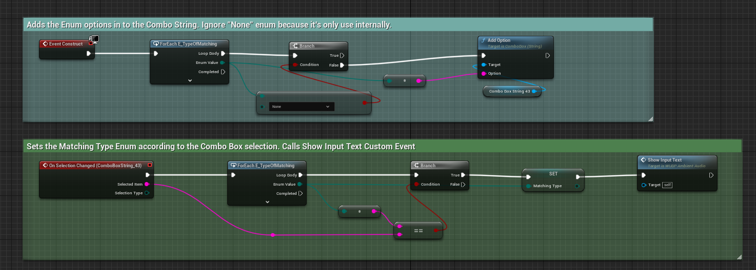 In the Event Construct I’m adding the Enum options (E_TypeOfMatching) into the Combo String. And On Selection Changed, sets the selected option as the Matching Type.