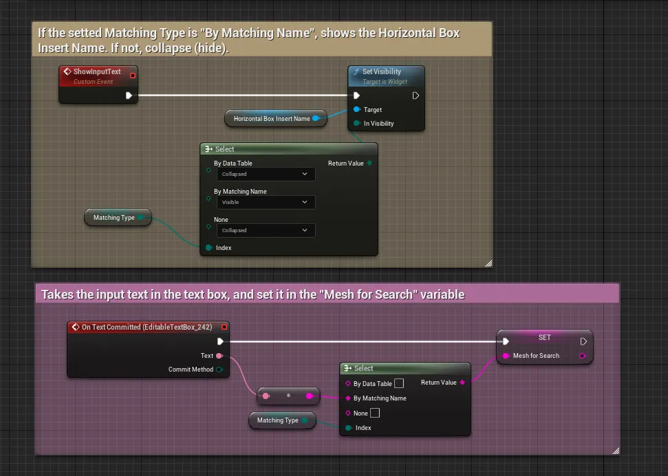 It goes similar for the Matching By Name type, but instead of using a Data Table, looks the Names of all the Meshes in the level, and if the String contains the user input string, a match was found. E.g: A Mesh of a cow named “SKM_Cow_Angus” will Contain the substring “Cow”.