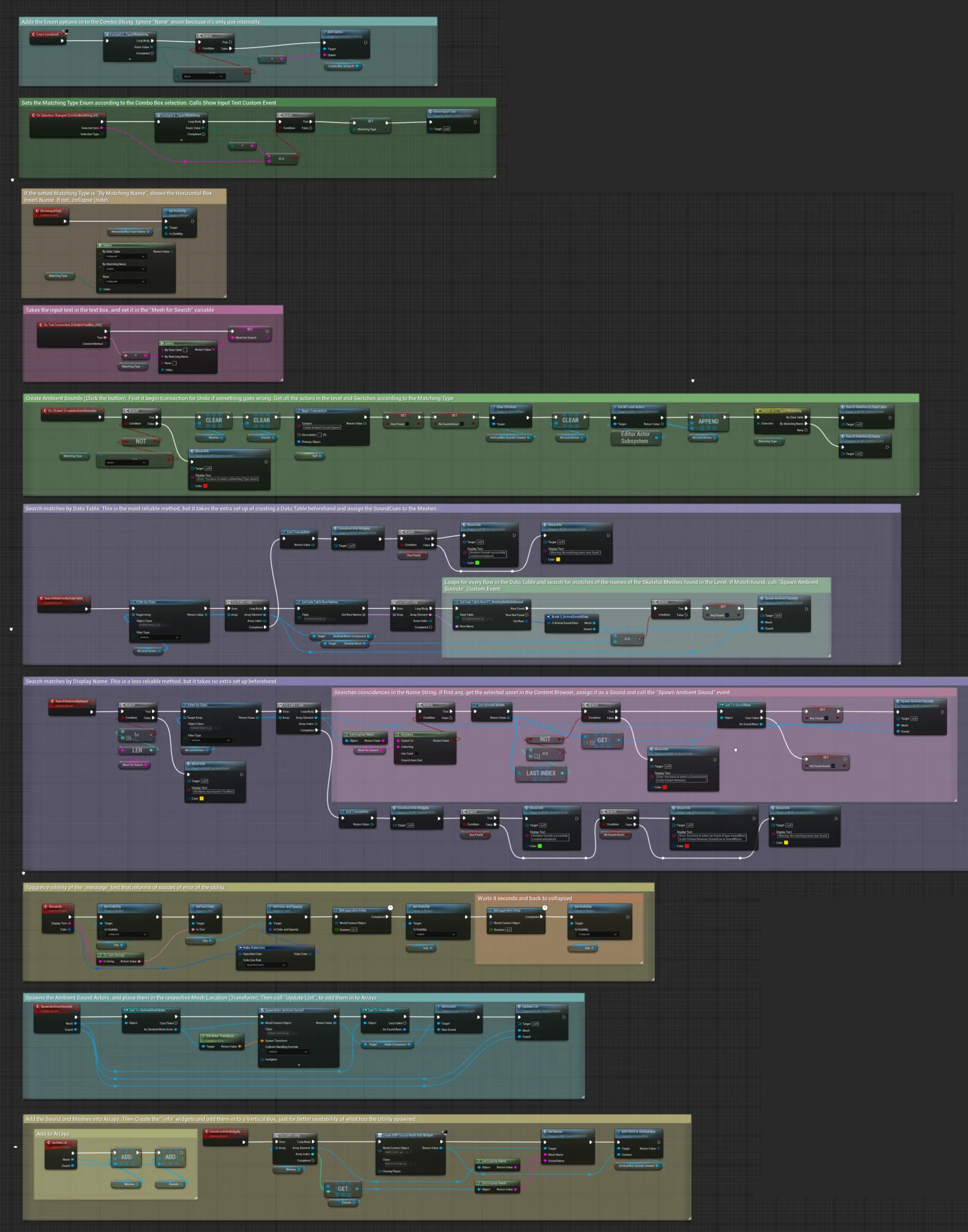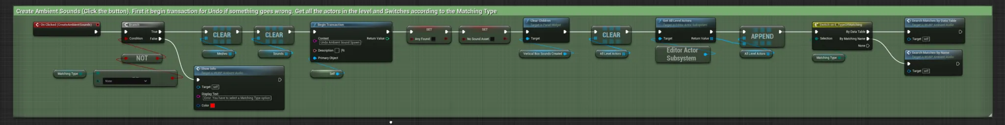 When the “Create Ambient Sounds” button is clicked, gets all the actors of the level and calls different Custom Events based on the type of Matching Type. It also Begins Transaction, that “records” all the changes in the level, for undoing later if some undesirable outcome happens.