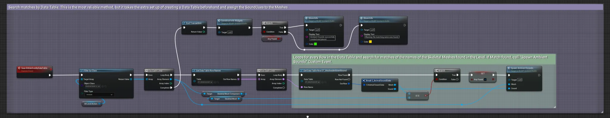 The logic for the Data Table type, simply searchs for all the Meshes in the level, and if found in the Data Table, get the related Sounds and spawn them in the level (calls the Event that does that, actually)