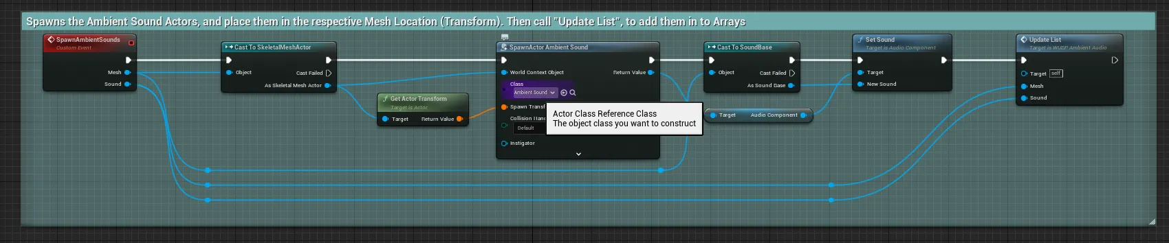This is the actual event that spawn the Ambient Sound Actors in the Transform (location) of the Meshes.