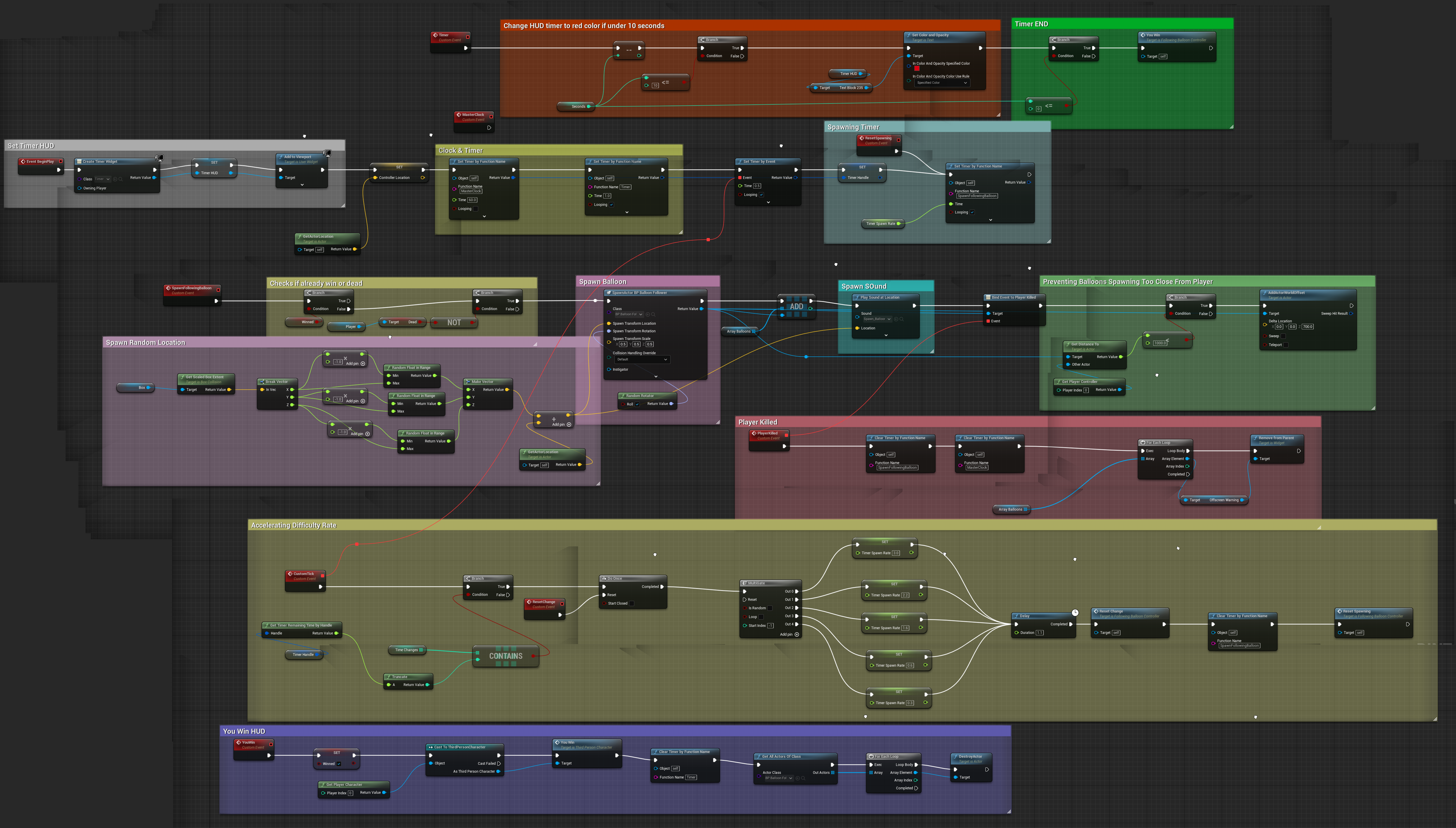 Then I realized that some ballons where spawning at a very short distance from the player, and killed it almost instantly. So I worked on a small fix that, if the balloon was spawning at less than a certain distance from the player, it would add to it some vertical axis vector value, resulting in a sort of blank space box or bubble around the player. For the final touch I added a simple HUD that displays a 60 second timer that goes red on the last 10 seconds, and if you reach to 0 having not died, a “You Win” menu is displayed.