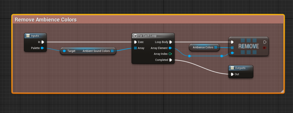 As you can see in the “Play & Stop” screenshot, I’m spawning an actor called “Ambience Color Behavior” for each ambience color founded in the Palette (please bear in mind that it also appears as “Ambience Color Spawnable” in other screenshots. I’ve changed the name of the actor later on and forgot to take new screenshots).