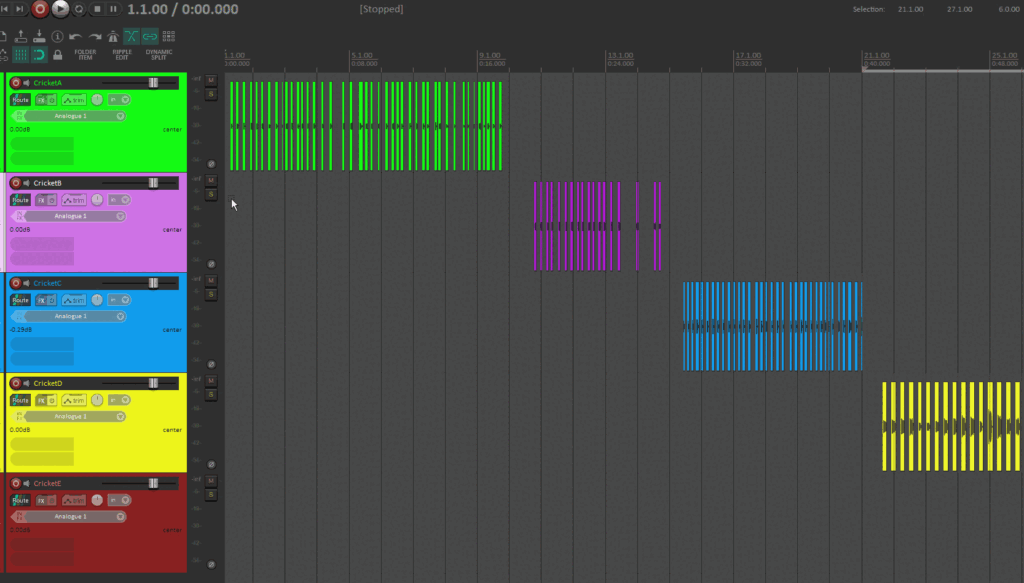 Here’s some individual crickets sounds in Reaper, that later I randomize using SoundCues.